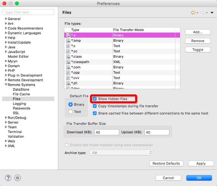 (2) Remote Systems -> File -> 把 "Show hidden files" 打勾 -> Apply -> OK